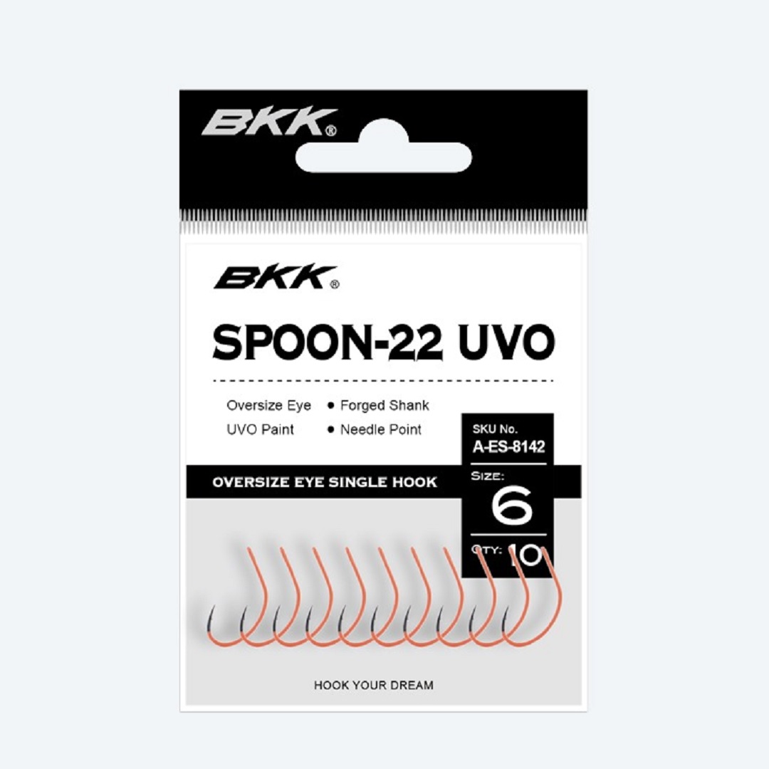 BKK SPOON-22 UVO is a single hook orange UV painted lure hook, which is not only suitable for spoon lures but also for wobblers and blades. It is also an excellent hook for, for example, rainbow or trout fishing in areas where treble hooks are not allowed. The large eye of the hook improves the mobility of the lure, and its slightly inward tip reduces bottom hit. The UV color stimulates the fish to strike and the small barb keeps the prey firmly hooked. An excellent choice, e.g. for trout spoons or with this you can replace, for example, the treble hook on a Lotto spinner.