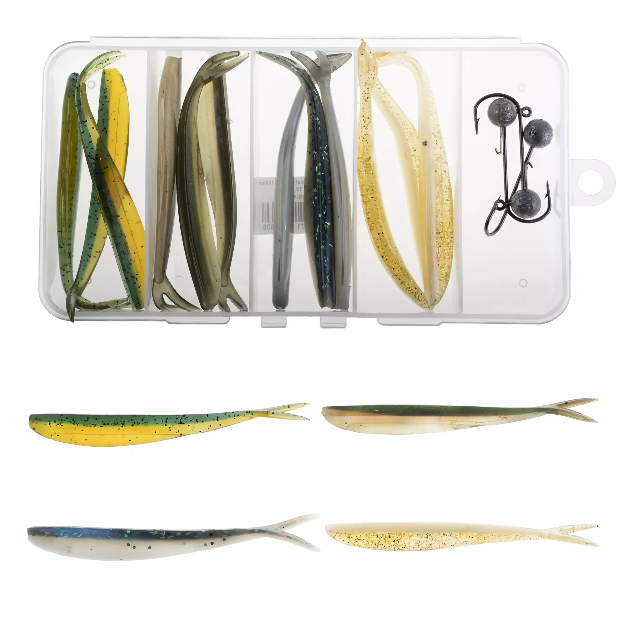 Veka jig assortment for vertical jigging of e.g. zander. 5-compartment box with 3 micro jig heads (7 g / #4/0) and 12 jigs (3 x 4 colors: 10 cm).