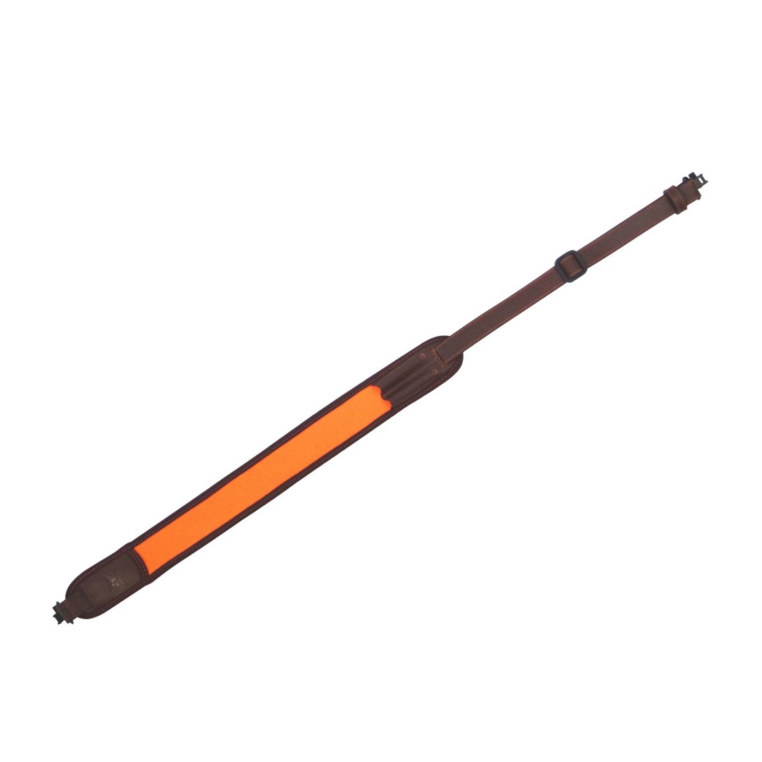 A wide neoprene gun sling with leather on both ends. The sling has metal quick fasteners and the sling also has space for two rifle cartridges.