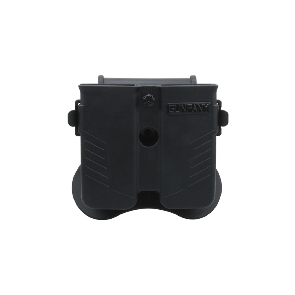 Universal pistol magazine compatibility with 9mm .40, .45, single or double magazine. Made of plastic polymer, adjustable tension, matte black.