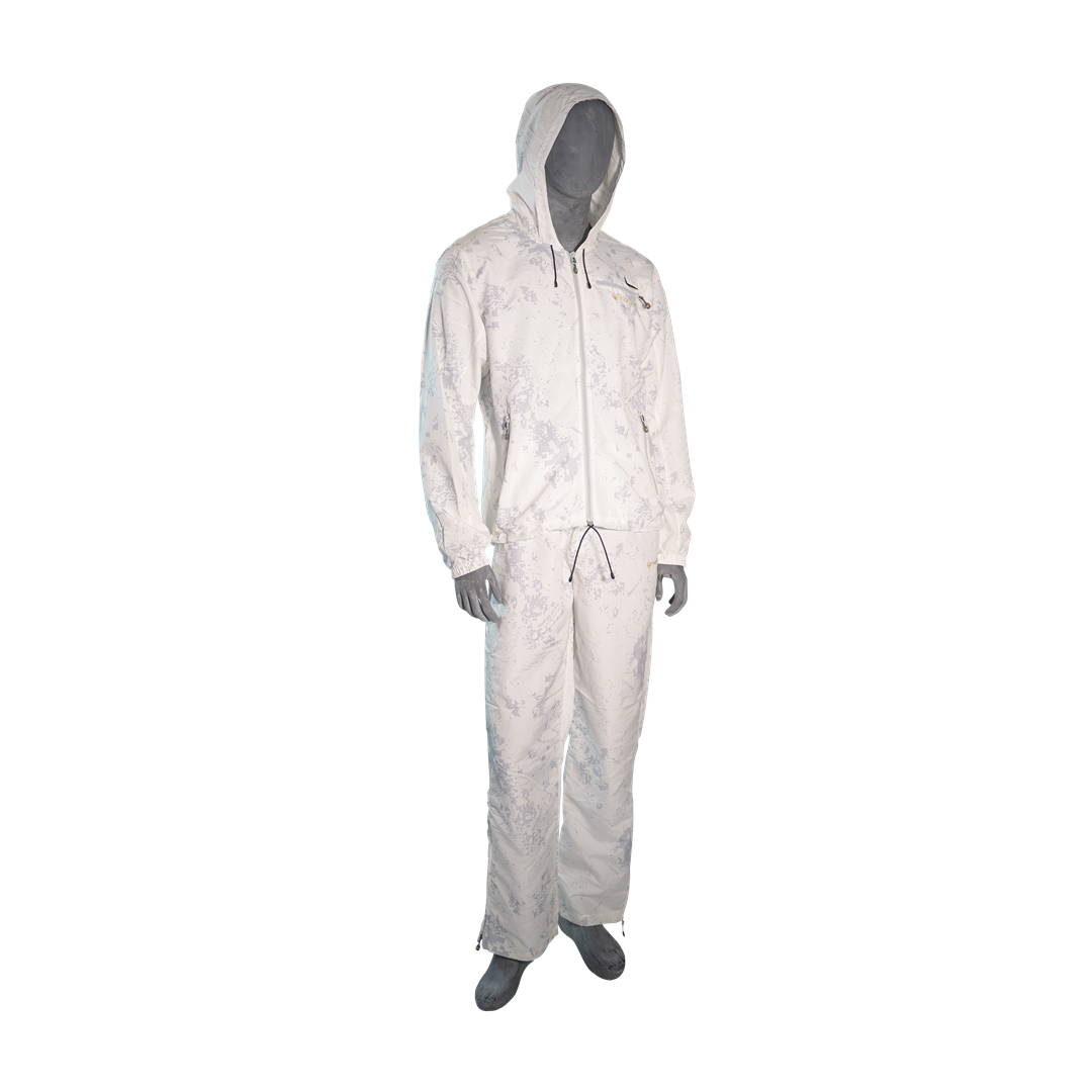 Haunter Driffle Snow Camo Set is a thin snow suit worn over hunting clothing. The package comes with separate pants and jacket. The suit has a roomy size, so it is easy to put on over normal hunting clothes. The jacket has two large pockets and a radio pocket.