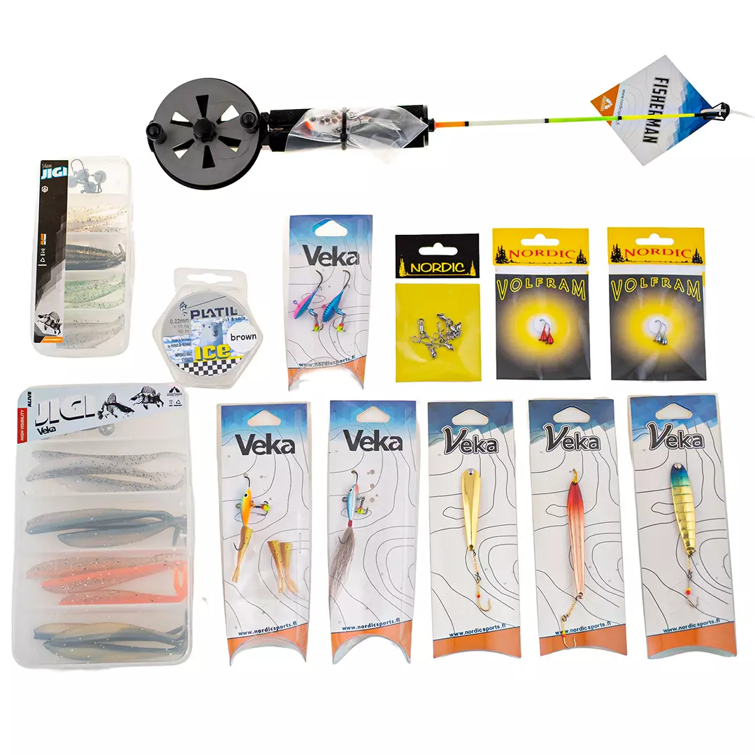 Kärnan i setet är Fisherman FIR Onkicombo F002, som erbjuder en pålitlig känsla för fiske. Det finns ett brett urval av olika beten, såsom traditionella vertikala pirkar i flera olika färger och storlekar (KILPI, SAKU och URA), som fungerar utmärkt i olika djup och ljusförhållanden.