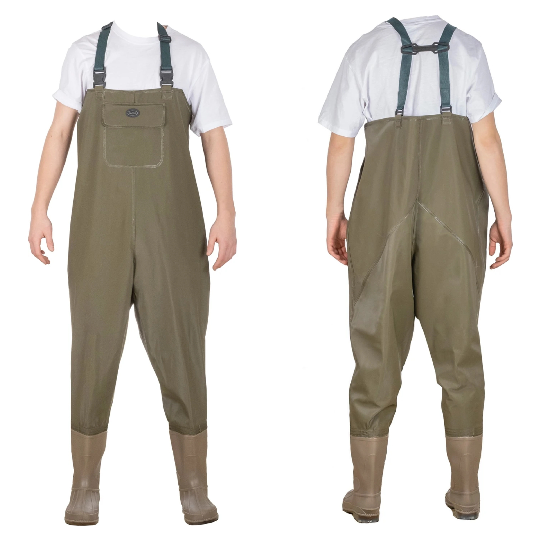 Vadare med justerbara elastiska remmar / hängslen för många användningsområden. Materialet är mjukt och bekvämt och prasslar inte. Byxorna har ett justerbart bälte. Den höga midjan, de svetsade sömmarna och den integrerade stöveln gör vadarbyxor prisvärda och perfekta för att fiska eller att reparera bryggan!