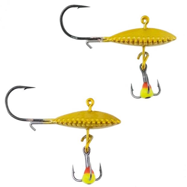 Lättad jigghuvud av zink. Jigghuvudet är format på ett sådant sätt att den går från sida till sida.