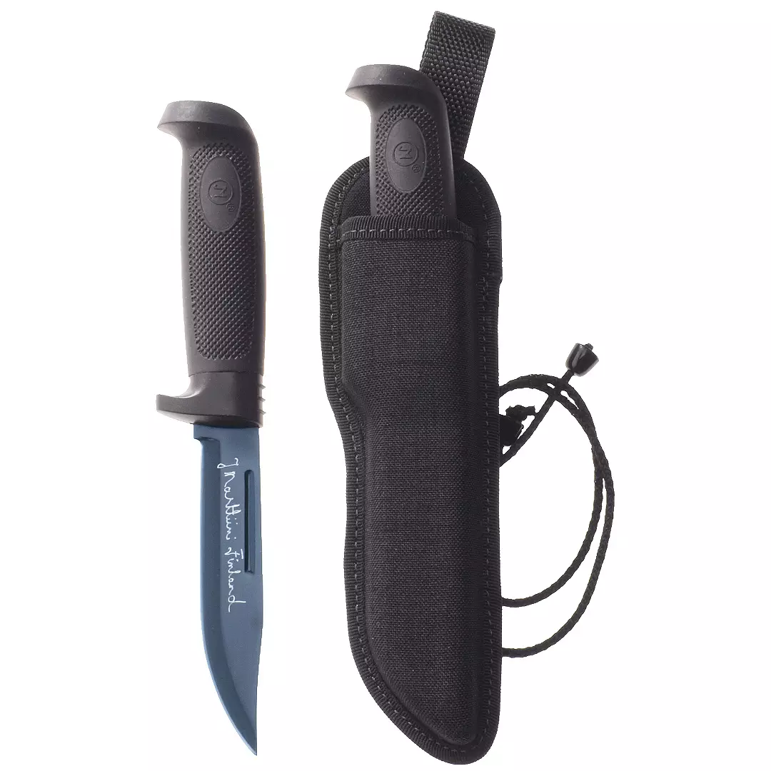 Kniven levereras med en slida tillverkad av slitstarkt Cordura-tyg. Slidan har praktiska fästsnören som kan användas för att förankra kniven säkert vid låret. Detta säkerställer att verktyget förblir i rörelse och lättåtkomligt även i svår terräng eller när man rör sig genom tät vegetation.